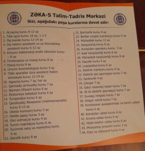 Uğurlu karyera sahibi olmaq istəyən gənclərə şərait yaratmaq, yol göstərmək hər bir ziyalı vətəndaşın borcudur. Layihə çərcivəsində hazırda başlıca məqsəd qısa müddətdə təhsil alaraq uğur qazanmaqdlr. 4 İlə başa gələn Ali təhsil diplomunun verə bilmədiyi iş yerini və əmək hakkını, Peşə Təhsil müəsissəsində öyrəndiyiniz peşə ilə qazana bilərsiniz.. Bu kampanyada ARAN ZONASI üzrə MİNGƏCEVİR şəhər “ZƏKA-S”-PEŞƏ MÜƏSİSSƏSİ 44 müxtəlif sahələr üzrə peşə İxtisası kurslarına və 19 Abituriyent hazırlıq kurslarına qəbul təklifi ilə yolunuzu gözləyir. İxtisaslar aşağıda praşuralarda qeyd olunmuşdur. Şəhər və regionlarda kampanya Oktyabr ayının sonuna qədər davam edir. Öz peşənizə yiyələnib, peşə sahibi olmağa TƏLƏSİN..
