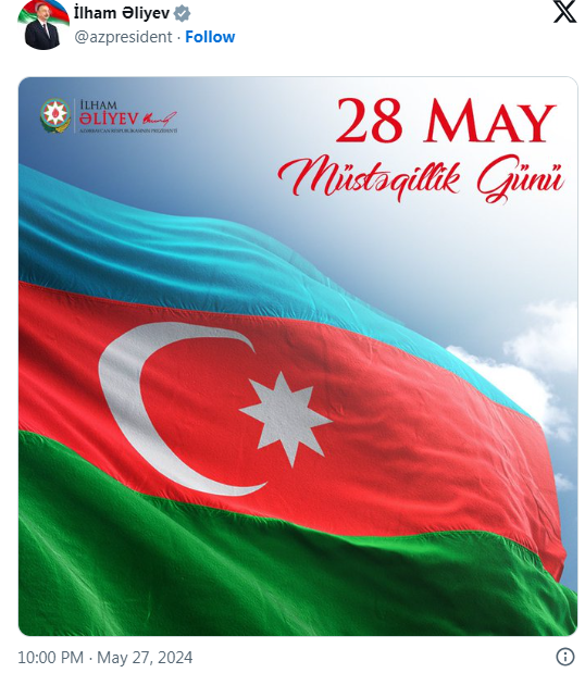 Prezident İlham Əliyev Müstəqillik Günü münasibətilə paylaşım edib – FOTO CƏMİYYƏT On May 27, 2024, 23:15 Paylaş Azərbaycan Respublikasının Prezidenti İlham Əliyev sosial şəbəkə hesabında 28 May Müstəqillik Günü münasibətilə paylaşım edib. İctimai Rəy paylaşımı təqdim edir: Paylaş